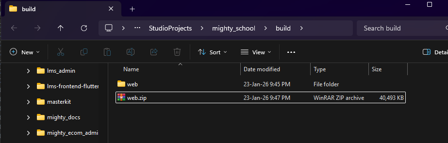 After successfully build. open /build/web folder. You will see web folder. Zip it and upload to your server.